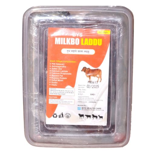 BYS Milkbo Laddu एक खास हर्बल पशु आहार सप्लीमेंट है जो गाय-भैंस का दूध बढ़ाने में मदद करता है। इसमें जड़ी-बूटियों, कैल्शियम और प्रोटीन का संतुलित मिश्रण होता है जो जानवर की शक्ति और दूध उत्पादन को बढ़ावा देता है।