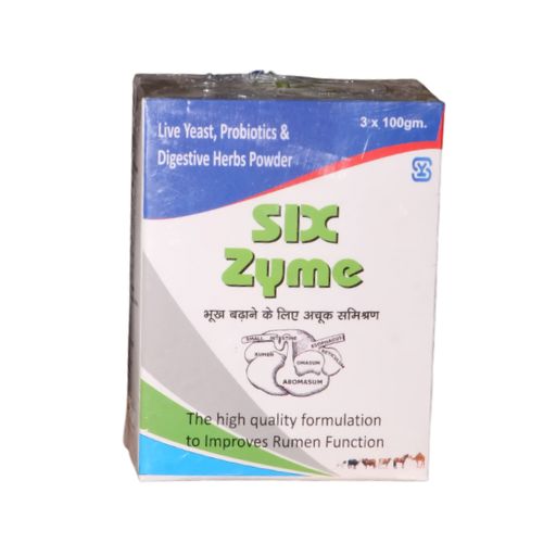 Six Zyme एक खास तरह का पशु चिकित्सा सप्लीमेंट है जो गाय और भैंस जैसे डेयरी पशुओं के पाचन तंत्र को मजबूत करने के लिए बनाया गया है। इसमें सक्रिय खमीर (Live Yeast), प्रोबायोटिक्स और पाचन में मदद करने वाले जड़ी-बूटियाँ शामिल हैं। ये सभी घटक मिलकर जानवर के रूमेन (पेट का मुख्य भाग) की कार्यक्षमता बढ़ाते हैं और पोषक तत्वों के बेहतर अवशोषण में सहायता करते हैं।